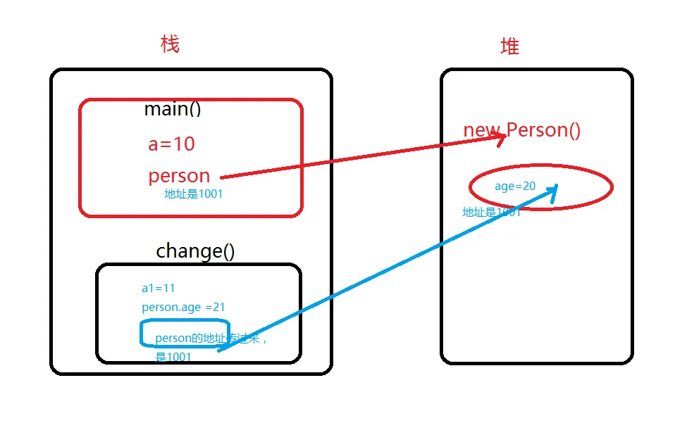 第2步 —— JVM执行change()函数,在栈内存中又开辟一个新的空间,存放int类型变量a和对象Person中person