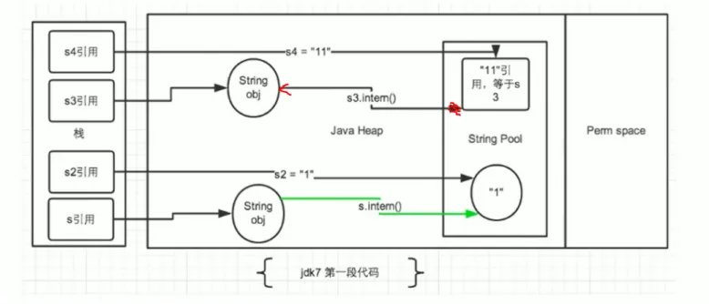 * ② s.intern()由于字符串常量池中已存在"1",所以不会创建新的字符串对象到字符串常量池,执行完毕。