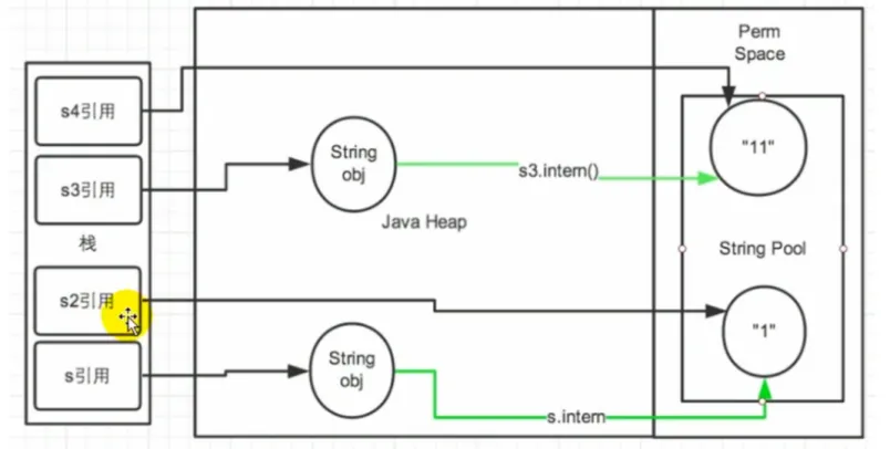 String s1="abc"; //由于内容一样,s1和s2指向堆空间的字符串常量池同一块内存区域