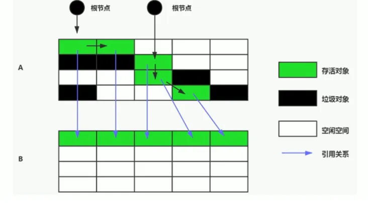 将活着的内存空间分为两块,每次只使用其中一块,在垃圾回收时将正在使用内存中的存活对象实体复制到未被使用的内存块中,之后清除正在使用内存块中的所有对象,交换两个内存的角色,最后完成垃圾回收
