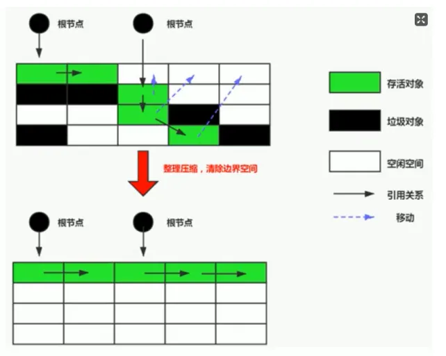 二者的本质差异在于标记-清除算法是一种非移动式的回收算法,标记-压缩是移动式的。是否移动回收后的存活对象是一项优缺点并存的风险决策(无内存碎片,但对象引用需要跟着改变)。可以看到,标记的存活对象将会被整理,按照内存地址依次排列,而未被标记的内存会被清理掉。如此一来,当我们需要给新对象分配内存时,JVM只需要持有一个内存的起始地址即可,这比维护一个空闲列表显然少了许多开销。