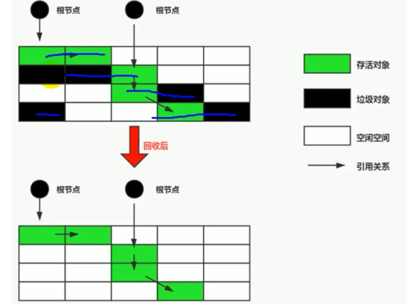 在堆里存放着几乎所有的Java对象实例,在GC执行垃圾回收之前,首先需要区分出内存中哪些是存活对象,哪些是已经死亡的对象。只有被标记为己经死亡的对象,GC才会在执行垃圾回收时,释放掉其所占用的内存空间,因此这个过程我们可以称为垃圾标记阶段。