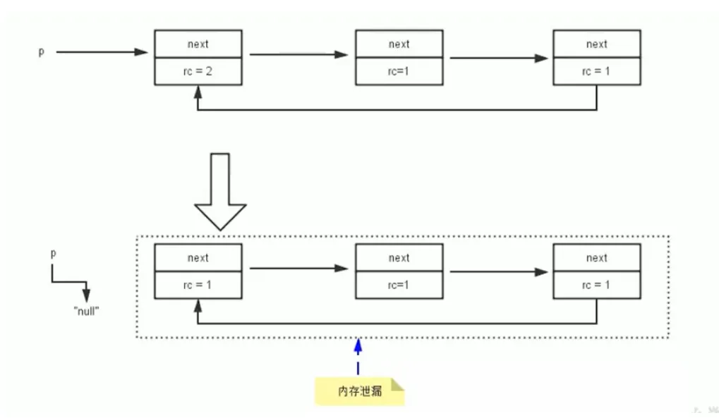 当p的指针断开的时候,内部的引用形成一个循环,这就是循环引用