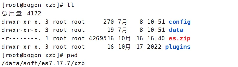 chmod 777 data将课程资料下的"ES安装"目录中的 es.zip上传到/data/soft/es7.17.7/xzb下,并进行解压