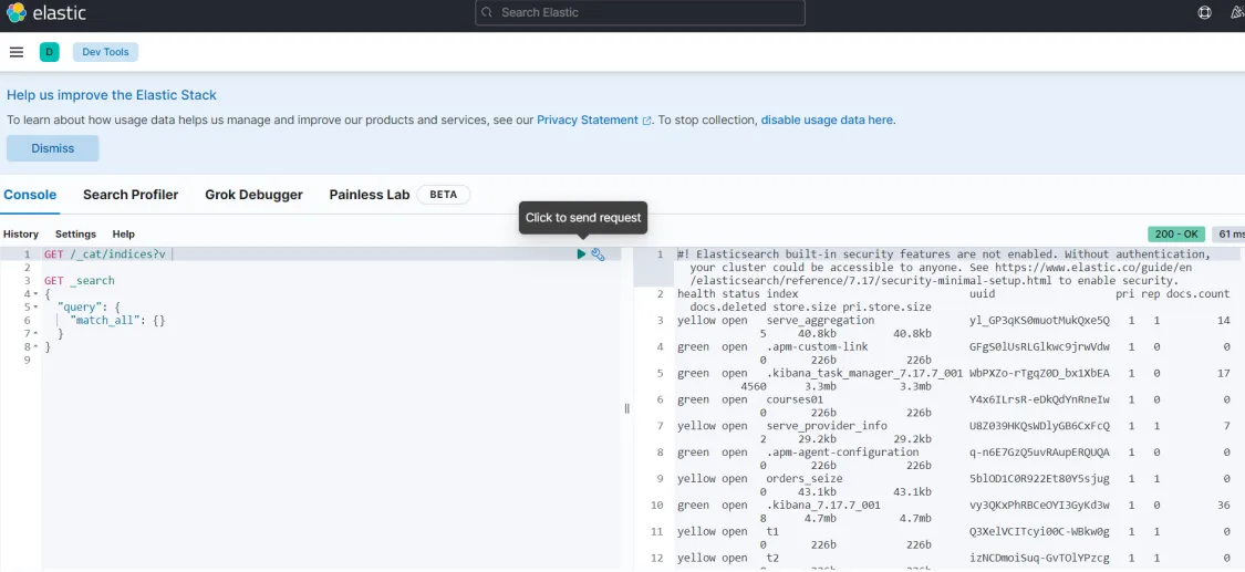 启动kibana容器成功,在浏览器输入地址访问:http://192.168.101.68:5601,进入DevTools,如下图: