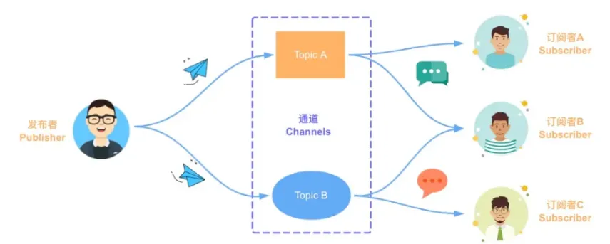 在发布订阅模式中有三个主要角色:Publisher(发布者)、 Channels(通道)和 Subscriber(订阅者)。