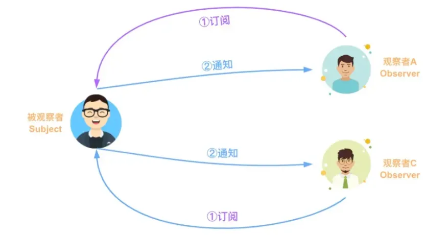 在观察者模式中有两个主要角色:Subject(主题)和 Observer(观察者)。