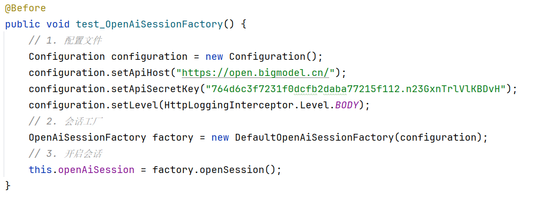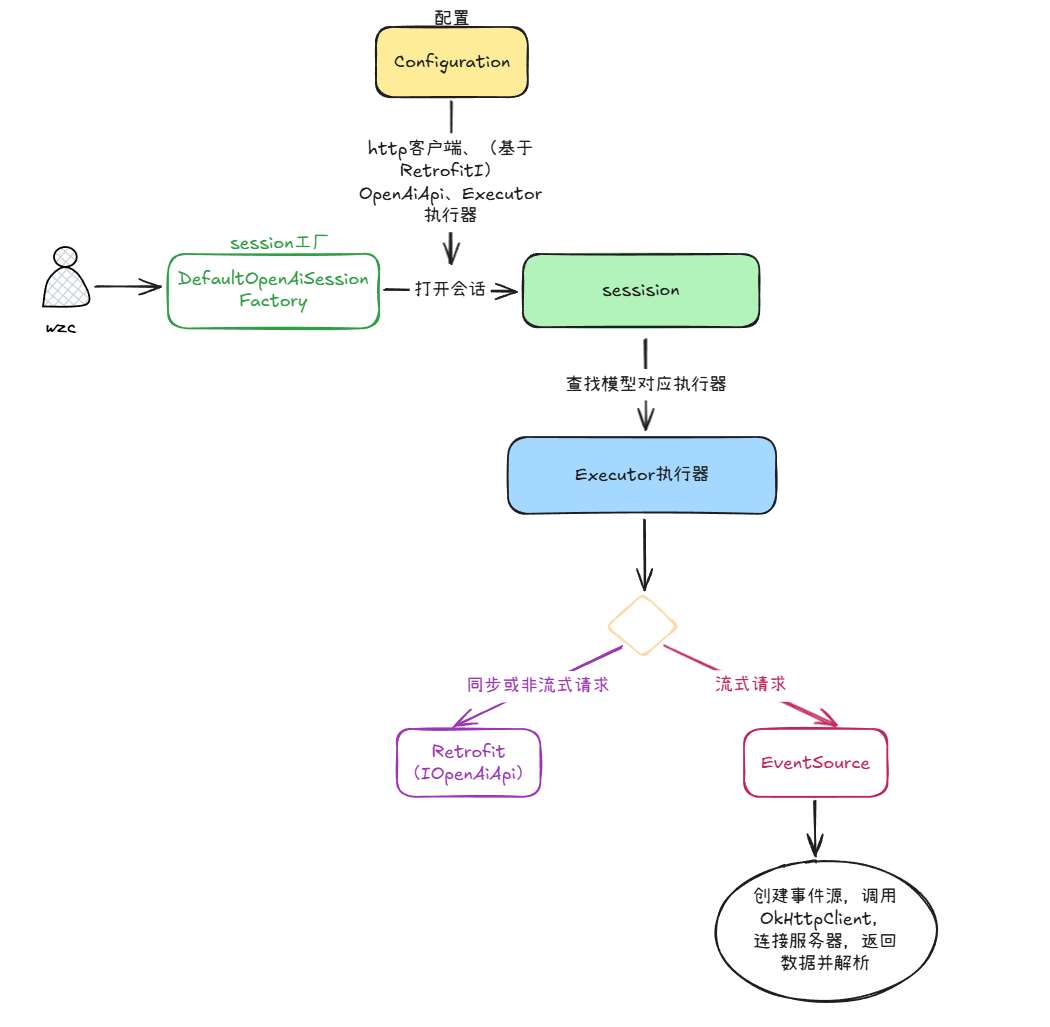 这里的DefaultOpenAiSessionFactory负责会话对象的创建,它将各种依赖(如 OkHttpClient、Retrofit API 对象)注入到Configuration中,最终生成一个OpenAiSession对象,体现了工厂方法隐藏创建细节的设计思想。