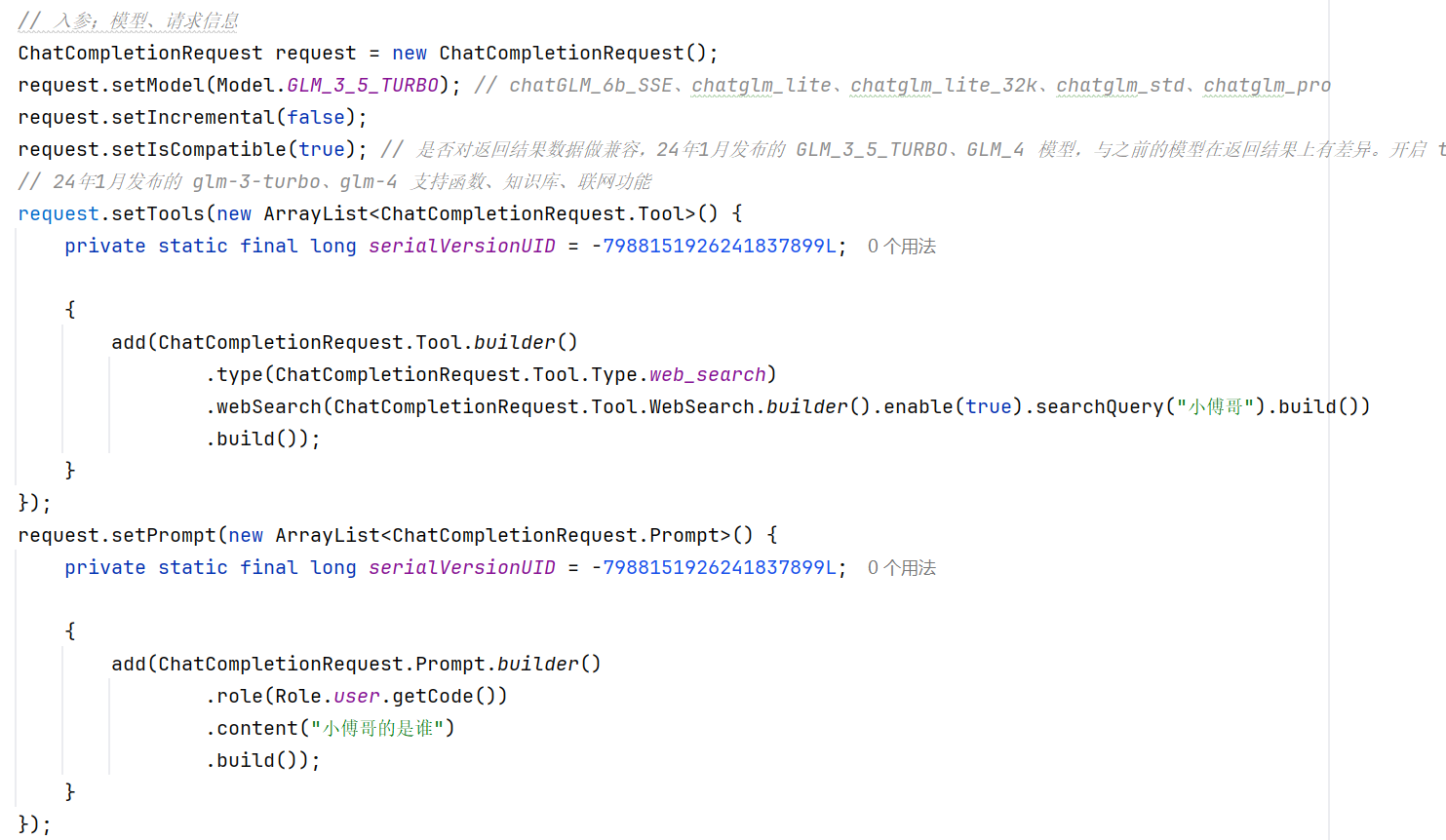 .webSearch(ChatCompletionRequest.Tool.WebSearch.builder().enable(true).searchQuery("小傅哥").build())