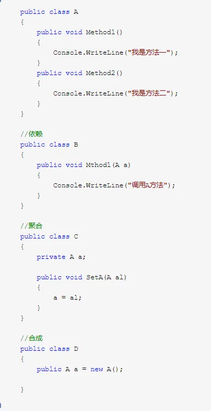 类A有2个方法,类B刚好需要调用这两个方法,我们第一可能会想到直接继承,这样“多快好省“,但随着业务进展,功能越来越复杂,A类需要增加其他方法,比如Method3 ,与B类毫无关联,将会大大增加耦合性,合用复用原则的核心就是使用关联,我们可以通过依赖、聚合、合成等关联方法,降低耦合,提高可维护性和降低维护成本。