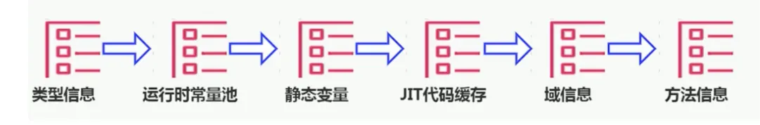 翻译:Java虚拟机有一个在所有Java虚拟机线程之间共享的方法区域。方法区类似于常规语言编译代码的存储区域,或类似于操作系统进程中的“文本”段。它存储类结构,例如运行时常量池、字段和方法数据,以及方法和构造函数的代码,包括类和实例初始化以及接口初始化中使用的特殊方法。