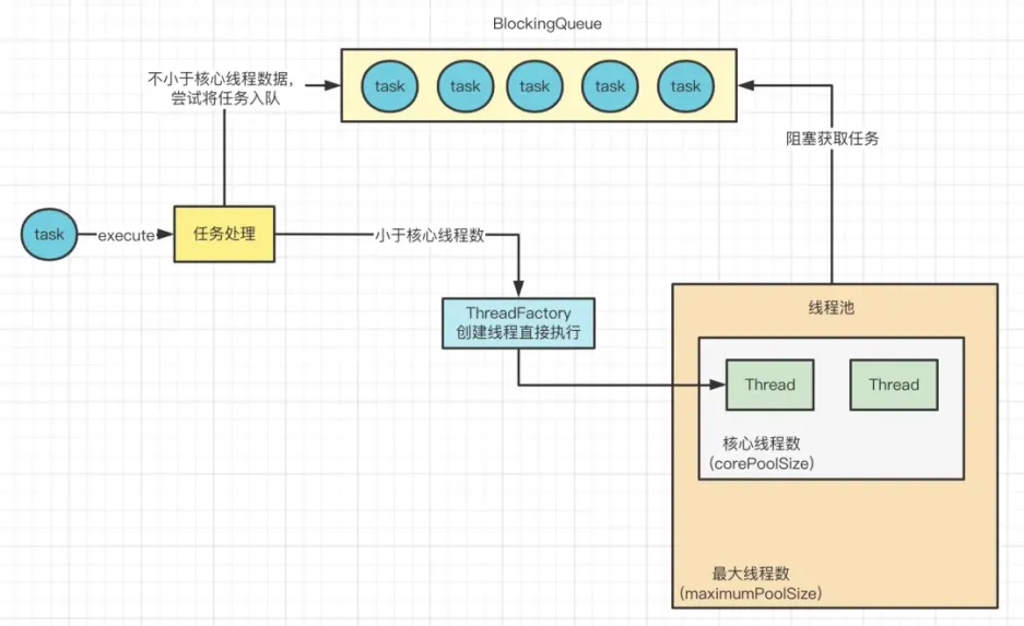 如果线程池里的线程数不再小于核心线程数呢?那么此时就会尝试将任务放入阻塞队列中,入队成功之后,如图