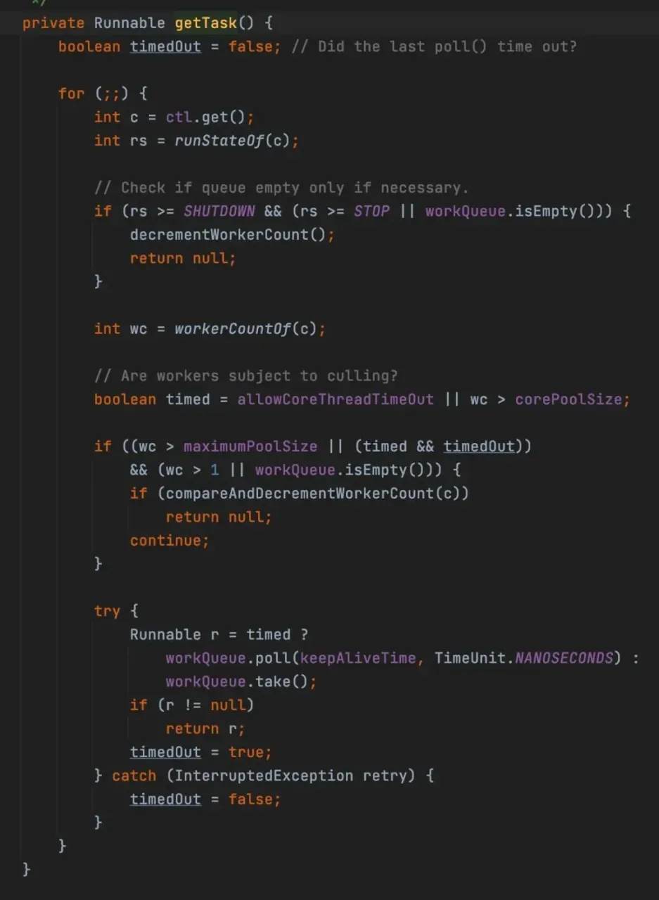 getTask方法,前面就是线程池的一些状态的判断,这里有一行代码