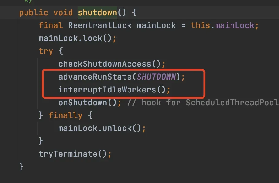 就是将线程池的状态修改为SHUTDOWN,然后尝试打断空闲的线程(如何判断空闲,上面在说Worker继承AQS的时候说过),也就是在阻塞等待任务的线程。