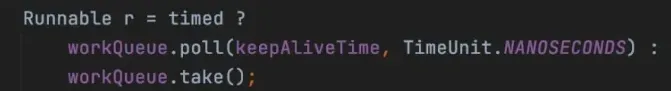 会根据是否允许超时来选择调用阻塞队列workQueue的poll方法或者take方法。如果允许超时,则会调用poll方法,传入keepAliveTime,也就是构造线程池时传入的空闲时间,这个方法的意思就是从队列中阻塞keepAliveTime时间来获取任务,获取不到就会返回null;如果不允许超时,就会调用take方法,这个方法会一直阻塞获取任务,直到从队列中获取到任务位置。从这里可以看到keepAliveTime是如何使用的了。