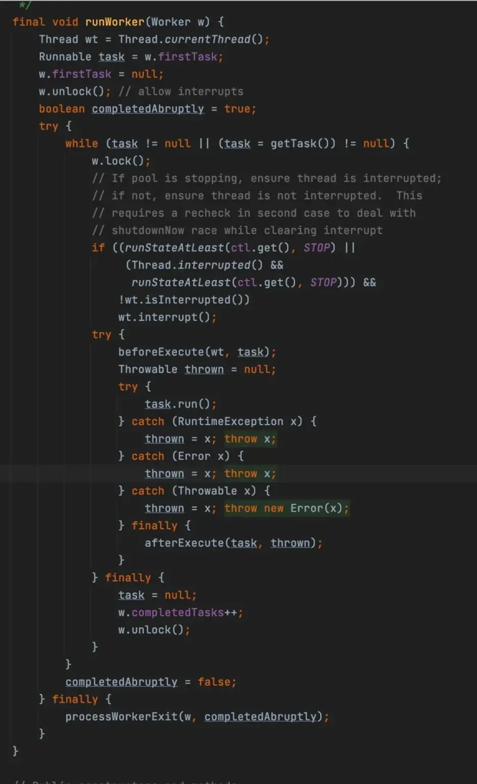创建线程来执行任务的方法上面提到是通过addWorker方法创建的。在创建Worker对象的时候,会把线程和任务一起封装到Worker内部,然后调用runWorker方法来让线程执行任务,接下来我们就来看一下runWorker方法。