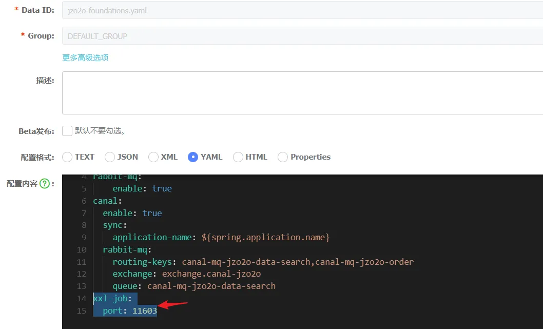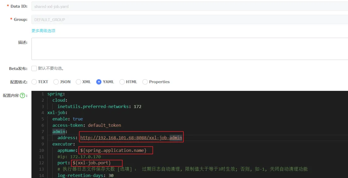 接下来进入nacos,配置shared-xxl-job.yaml: