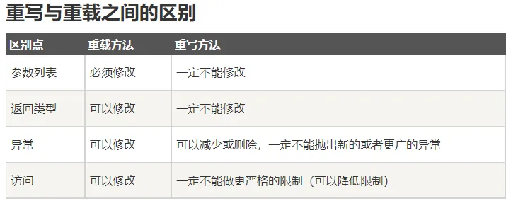 方法重写是存在子父类之间的,子类定义的方法在父类中的方法有相同方法名字,相同的参数表和相同的返回类型。