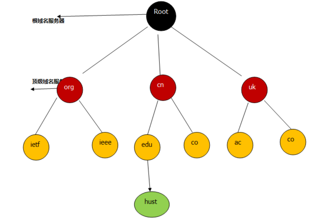 域名是指为了识别主机名称和组织机构名称而采用的一种具有分层的名称。例如,华中科技大学的域名如下:hust.edu.cn 最左边的 hust 表示华中科技大学,edu表示教育机构,cn表示中国。dns的分层如下图所示: