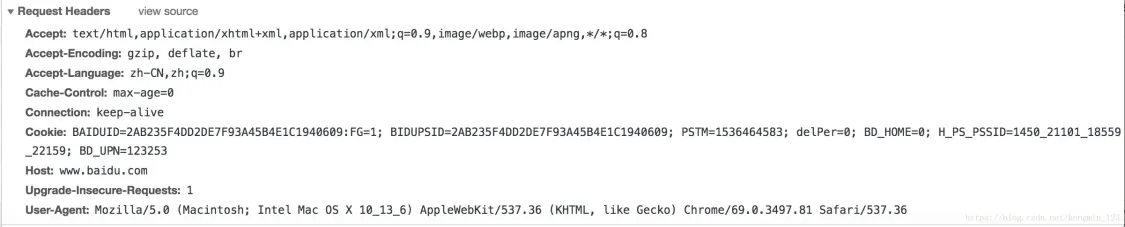 这个get请求包含了主机(Host)、用户代理(User-Agent),用户代理就是自己的浏览器,它是你的"代理人",Connection(连接属性)中的keep-alive表示浏览器告诉对方服务器在传输完现在请求的内容后不要断开连接,不断开的话下次继续连接速度就很快了。可能还会有Cookies,Cookies保存了用户的登陆信息,一般保存的是用户的JSESSIONID,在每次向服务器发送请求的时候会重复发送给服务器。