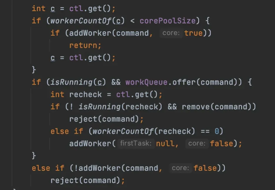 workerCountOf(c)<corePoolSize:这行代码就是判断是否小于核心线程数,是的话就通过addWorker方法,addWorker就是添加线程来执行任务。