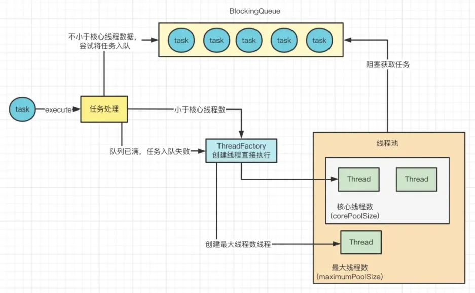如果线程池里的线程数不再小于核心线程数呢?那么此时就会尝试将任务放入阻塞队列中,入队成功之后,如图